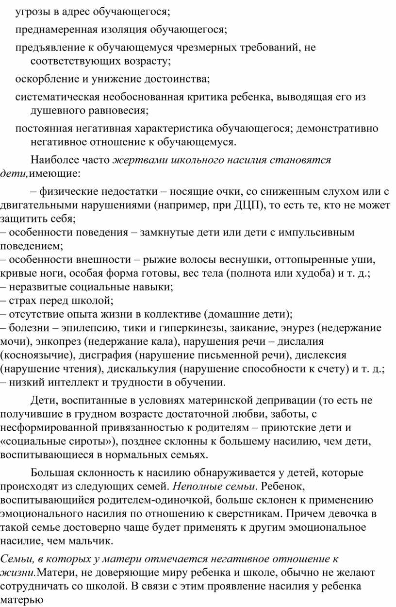 – физические недостатки – носящие очки, со сниженным слухом или с двигательными нарушениями (например, при ДЦП), то есть те, кто не может защитить себя; – особенности поведения – замкнутые дети или дети с импульсивным поведением; – особенности внешности – рыжие волосы веснушки, оттопыренные уши, кривые ноги, особая форма готовы, вес тела (полнота или худоба) и т. д.; – неразвитые социальные навыки; – страх перед школой; – отсутствие опыта жизни в коллективе (домашние дети); – болезни – эпилепсию, тики и гиперкинезы, заикание, энурез (недержание мочи), энкопрез (недержание кала), нарушения речи – дислалия (косноязычие), дисграфия (нарушение письменной речи), дислексия (нарушение чтения), дискалькулия (нарушение способности к счету) и т. д.; – низкий интеллект и трудности в обучении.