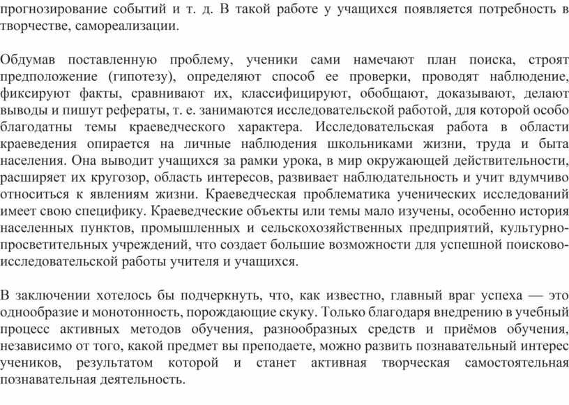Обдумав поставленную проблему, ученики сами намечают план поиска, строят предположение (гипотезу), определяют способ ее проверки, проводят наблюдение, фиксируют факты, сравнивают их, классифицируют, обобщают, доказывают, делают выводы и пишут рефераты, т. е. занимаются исследовательской работой, для которой особо благодатны темы краеведческого характера. Исследовательская работа в области краеведения опирается на личные наблюдения школьниками жизни, труда и быта населения. Она выводит учащихся за рамки урока, в мир окружающей действительности, расширяет их кругозор, область интересов, развивает наблюдательность и учит вдумчиво относиться к явлениям жизни. Краеведческая проблематика ученических исследований имеет свою специфику. Краеведческие объекты или темы мало изучены, особенно история населенных пунктов, промышленных и сельскохозяйственных предприятий, культурно-просветительных учреждений, что создает большие возможности для успешной поисково-исследовательской работы учителя и учащихся.