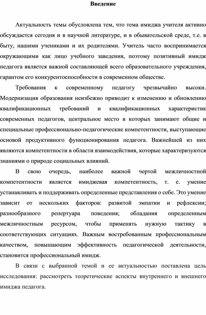 В связи с выбранной темой и ее актуальностью поставлена цель исследования: рассмотреть теоретические аспекты внутреннего и внешнего имиджа педагога.