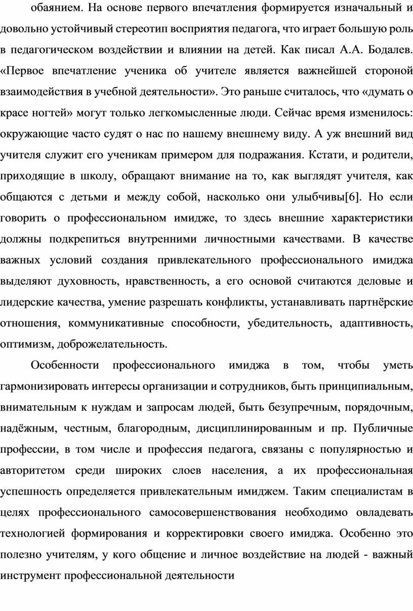 Имидж педагога - это его внешние и внутренние характеристики, которые играют важную роль в его профессиональной деятельности. Учитель должен обладать привлекательной внешностью, хорошим вкусом, личным обаянием. На основе первого впечатления формируется изначальный и довольно устойчивый стереотип восприятия педагога, что играет большую роль в педагогическом воздействии и влиянии на детей. Как писал А.А. Бодалев. «Первое впечатление ученика об учителе является важнейшей стороной взаимодействия в учебной деятельности». Это раньше считалось, что «думать о красе ногтей» могут только легкомысленные люди. Сейчас время изменилось: окружающие часто судят о нас по нашему внешнему виду. А уж внешний вид учителя служит его ученикам примером для подражания. Кстати, и родители, приходящие в школу, обращают внимание на то, как выглядят учителя, как общаются с детьми и между собой, насколько они улыбчивы[6]. Но если говорить о профессиональном имидже, то здесь внешние характеристики должны подкрепиться внутренними личностными качествами. В качестве важных условий создания привлекательного профессионального имиджа выделяют духовность, нравственность, а его основой считаются деловые и лидерские качества, умение разрешать конфликты, устанавливать партнёрские отношения, коммуникативные способности, убедительность, адаптивность, оптимизм, доброжелательность.