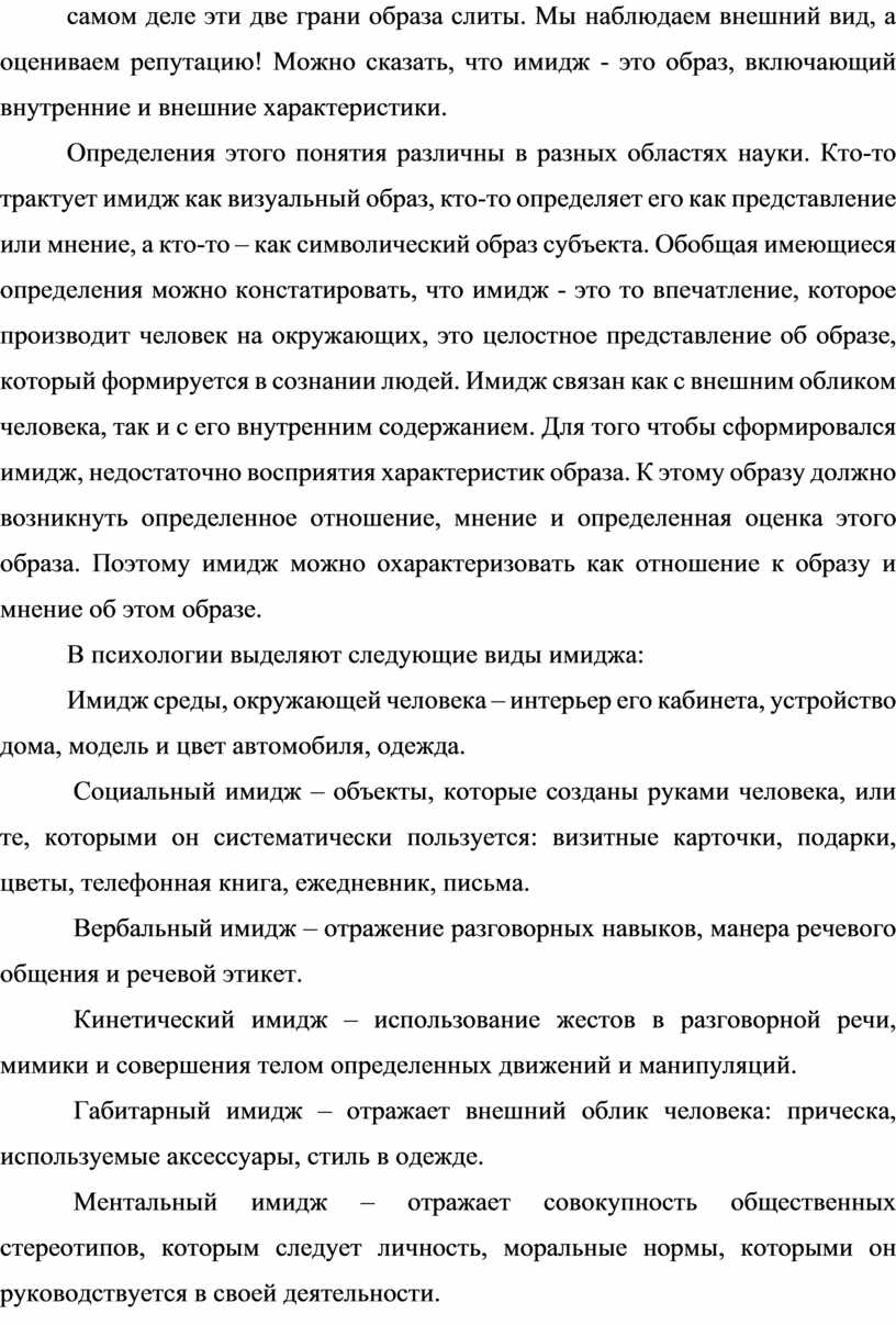 В обыденном понимании слово имидж употребляется по отношению к человеку в двух смыслах: как внешний вид человека и как его репутация. На самом деле эти две грани образа слиты. Мы наблюдаем внешний вид, а оцениваем репутацию! Можно сказать, что имидж - это образ, включающий внутренние и внешние характеристики.
