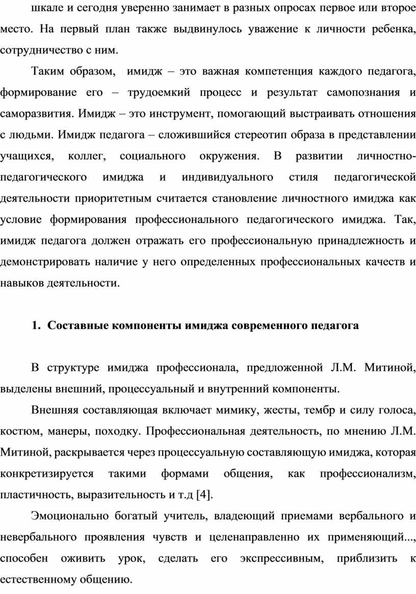 Имидж учителя содержит следующие структурные компоненты: индивидуальные и личностные качества, коммуникативные, особенности профессиональной деятельности и поведения. Возможно говорить об общем имидже педагога и ситуативном воплощении его образа.