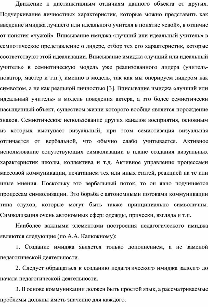 Движение к дистинктивным отличиям данного объекта от других. Подчеркивание личностных характеристик, которые можно представить как введение имиджа лучшего или идеального учителя в понятие «свой», в отличие от понятия «чужой». Вписывание имиджа «лучший или идеальный учитель» в семиотическое представление о лидере, отбор тех его характеристик, которые соответствуют этой идеализации. Вписывание имиджа «лучший или идеальный учитель» в семиотическую модель уже реализованного лидера (учитель-новатор, мастер и т.п.), именно в модель, так как мы оперируем лидером как символом, а не как реальной личностью [3]. Вписывание имиджа «лучший или идеальный учитель» в модель поведения актера, а это более семиотически насыщенный объект, существом жизни которого вообще является порождение знаков. Семиотическое использование других каналов восприятия, основным из которых выступает визуальный, при этом семиотизация визуальная отличается от вербальной, что обычно слабо учитывается. Активное использование сопутствующих символизации в плане создания визуальных характеристик школы, коллектива и т.д. Активное управление процессами массовой коммуникации, печатанием тех или иных статей, реакцией на те или иные мнения. Поскольку это вербальный поток, то он явно подчиняется процессам символизации. Это борьба с автономными потоками коммуникации типа слухов, которые могут быть также принципиально символичны. Символизация очень автономных сфер: одежды, прически, взгляда и т.п.