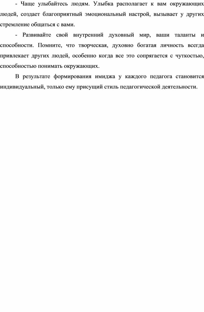 В результате формирования имиджа у каждого педагога становится индивидуальный, только ему присущий стиль педагогической деятельности.