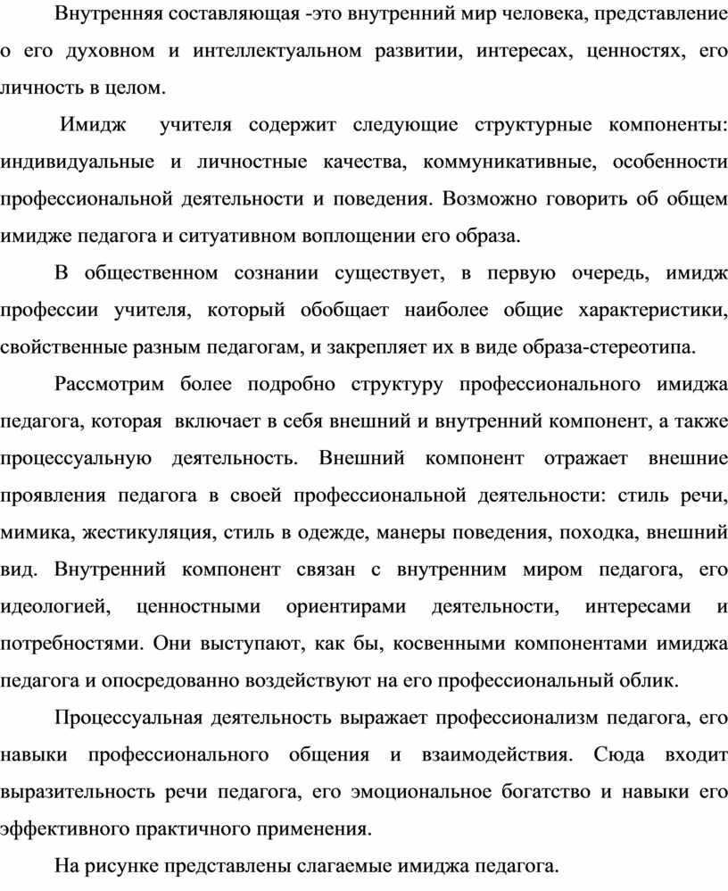 Рассмотрим более подробно структуру профессионального имиджа педагога, которая включает в себя внешний и внутренний компонент, а также процессуальную деятельность. Внешний компонент отражает внешние проявления педагога в своей профессиональной деятельности: стиль речи, мимика, жестикуляция, стиль в одежде, манеры поведения, походка, внешний вид. Внутренний компонент связан с внутренним миром педагога, его идеологией, ценностными ориентирами деятельности, интересами и потребностями. Они выступают, как бы, косвенными компонентами имиджа педагога и опосредованно воздействуют на его профессиональный облик.