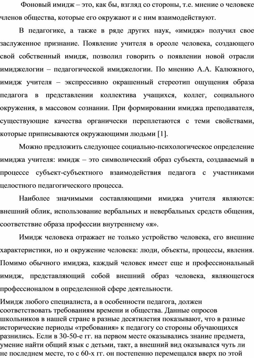 В педагогике, а также в ряде других наук, «имидж» получил свое заслуженное признание. Появление учителя в ореоле человека, создающего свой собственный имидж, позволил говорить о появлении новой отрасли имиджелогии – педагогической имиджелогии. По мнению А.А. Калюжного, имидж учителя – экспрессивно окрашенный стереотип ощущения образа педагога в представлении коллектива учащихся, коллег, социального окружения, в массовом сознании. При формировании имиджа преподавателя, существующие качества органически переплетаются с теми свойствами, которые приписываются окружающими людьми [1].