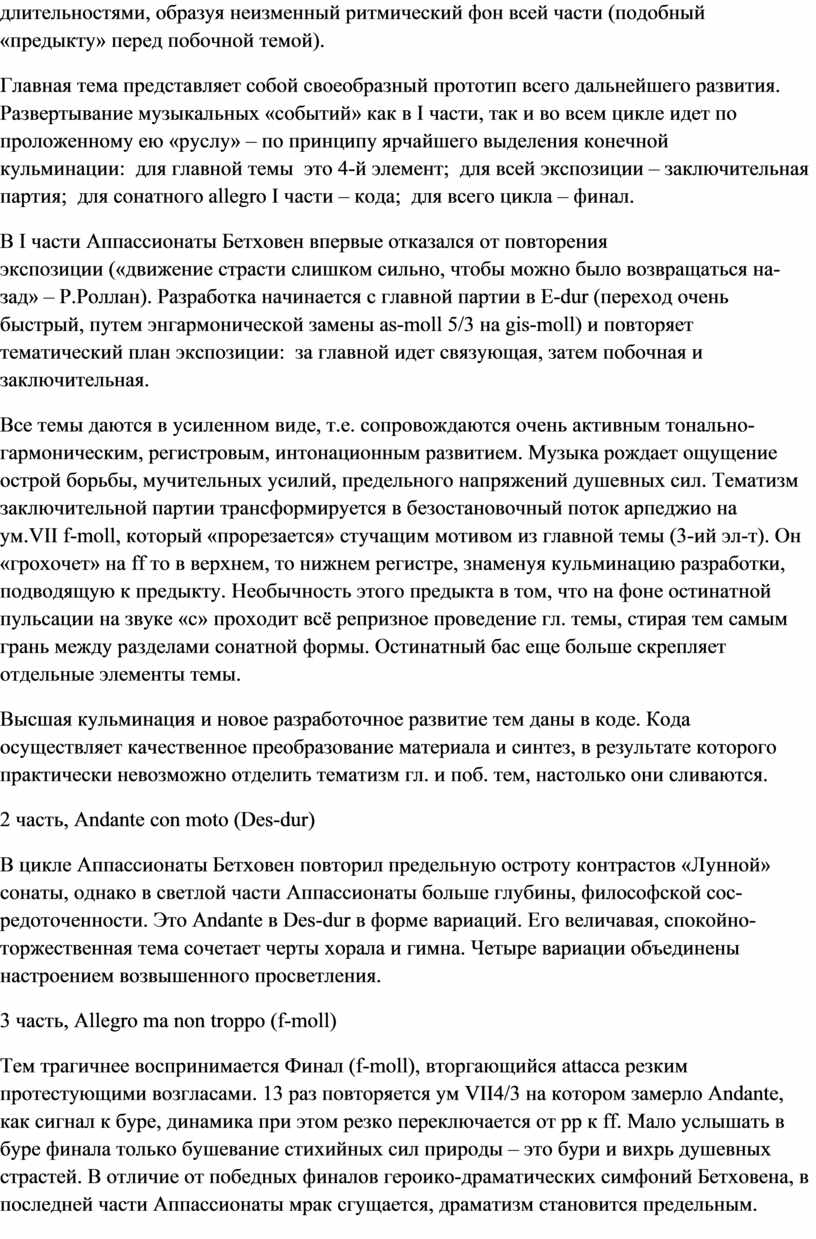 Аппассионата – самая симфоничная из всех бетховенских сонат. Ее Зх-частный цикл отмечен поразительным единством: он представляет неразрывное целое, в котором роль драматургического центра выполняет финал. С исключительной наглядностью Аппассионата демонстрирует самые типичные закономерности бетховенского развития: это развитие, осуществляемое через борьбу противоречий, единство противоположностей.