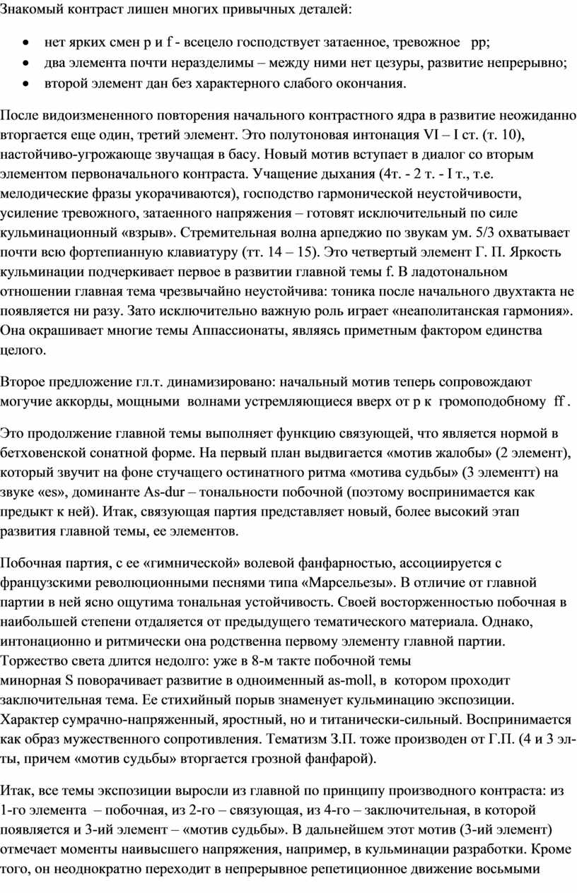 Итак, все темы экспозиции выросли из главной по принципу производного контраста: из 1-го элемента – побочная, из 2-го – связующая, из 4-го – заключительная, в которой появляется и 3-ий элемент – «мотив судьбы». В дальнейшем этот мотив (3-ий элемент) отмечает моменты наивысшего напряжения, например, в кульминации разработки. Кроме того, он неоднократно переходит в непрерывное репетиционное движение восьмыми длительностями, образуя неизменный ритмический фон всей части (подобный «предыкту» перед побочной темой).