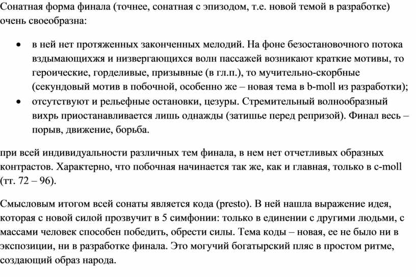 при всей индивидуальности различных тем финала, в нем нет отчетливых образных контрастов. Характерно, что побочная начинается так же, как и главная, только в c-moll (тт. 72 – 96).