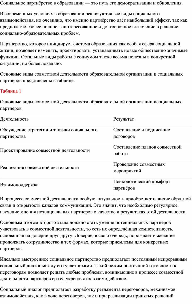 В современных условиях в образовании реализуются все виды социального взаимодействия, но очевидно, что именно партнёрство даёт наибольший эффект, так как предполагает более полное, заинтересованное и долгосрочное включение в решение социально-образовательных проблем.