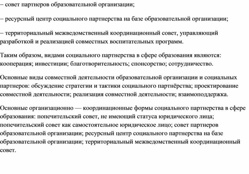 Основные организационно — координационные формы социального партнерства в сфере образования: попечительский совет, не имеющий статуса юридического лица; попечительский совет как самостоятельное юридическое лицо; совет партнеров образовательной организации; ресурсный центр социального партнерства на базе образовательной организации; территориальный межведомственный координационный совет.