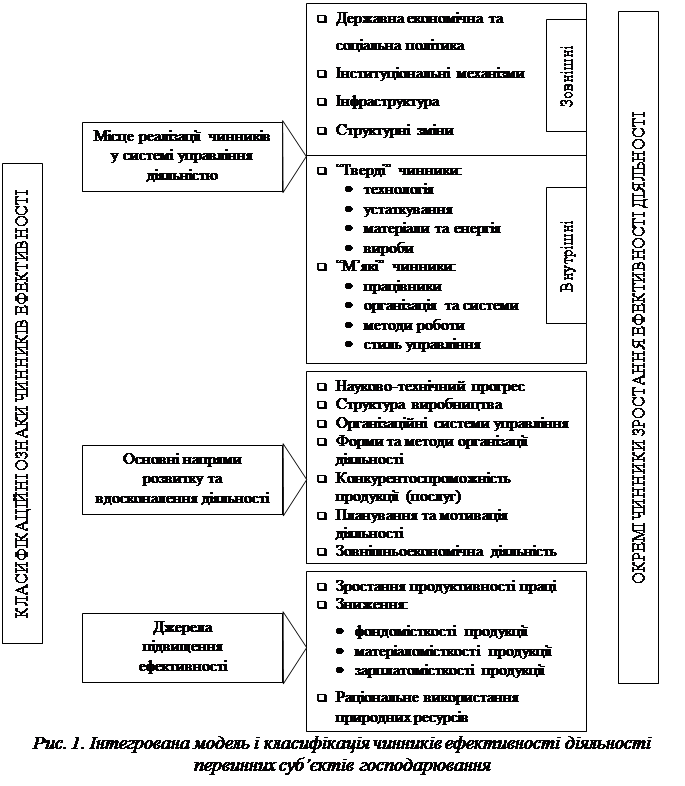 Можливі напрямки реалізації внутрішніх і зовнішніх чинників підвищення ефективності діяльності підприємств та організацій неоднакові за мірою впливу, ступенем використання та контролю. Тому для практики господарювання, для керівників і відповідних спеціалістів (менеджерів) суб'єктів підприємницької чи інших видів діяльності важливим є детальне знання масштабів дії, форм контролю та використання найбільш істотних внутрішніх і зовнішніх чинників ефективності на різних рівнях управління діяльністю трудових колективів. Той чи той суб'єкт господарювання може й мусить постійно контролювати процес використання внутрішніх чинників через розробку та послідовну реалізацію власної програми підвищення ефективності діяльності, а також ураховувати вплив на неї зовнішніх чинників. У зв'язку з цим виникає необхідність конкретизації напрямків дії та використання головних внутрішніх і зовнішніх чинників підвищення ефективності діяльності суб'єктів господарювання.