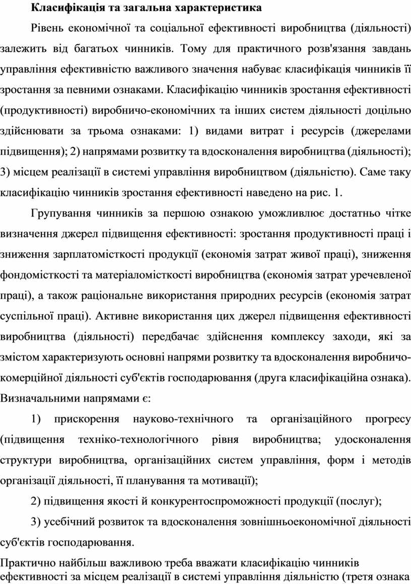 Рівень економічної та соціальної ефективності виробництва (діяльності) залежить від багатьох чинників. Тому для практичного розв'язання завдань управління ефективністю важливого значення набуває класифікація чинників її зростання за певними ознаками. Класифікацію чинників зростання ефективності (продуктивності) виробничо-економічних та інших систем діяльності доцільно здійснювати за трьома ознаками: 1) видами витрат і ресурсів (джерелами підвищення); 2) напрямами розвитку та вдосконалення виробництва (діяльності); 3) місцем реалізації в системі управління виробництвом (діяльністю). Саме таку класифікацію чинників зростання ефективності наведено на рис. 1.