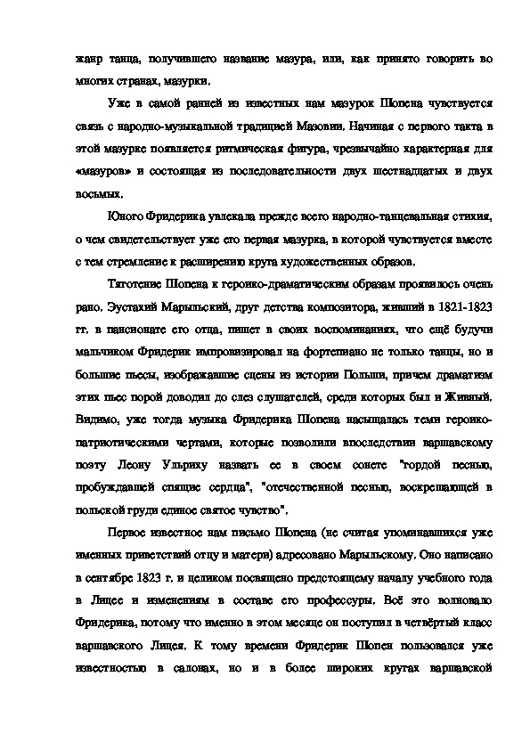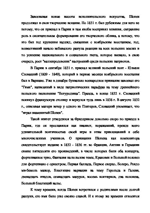 Творчество гениального польского композитора и пианиста Фридерика Шопена принадлежит к числу высших достижений мировой музыкальной культуры. Значение музыки Шопена определяется не только ее дивной красотой, поэтической выразительностью образов и мастерством их развития, а и тем, что, достигнув классических высот, он утвердил своими произведениями величие запечатлевшегося в них духовного богатства родного народа, входящего в семью славянских народов.Реферат