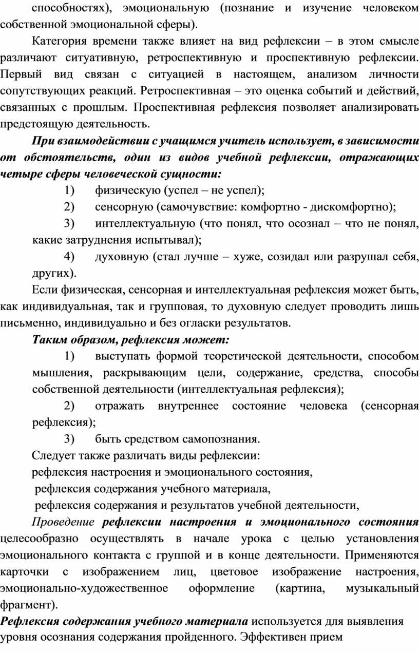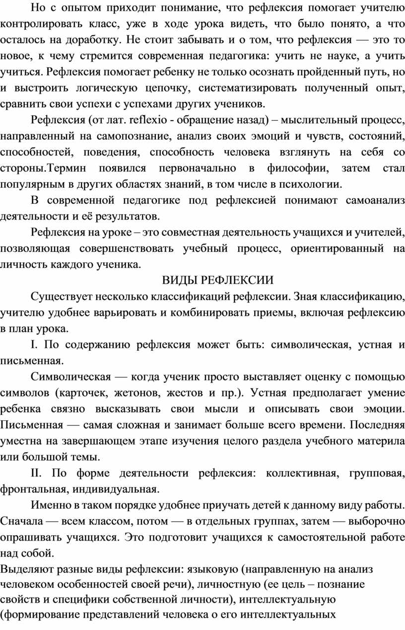 В современной педагогике под рефлексией понимают самоанализ деятельности и её результатов.