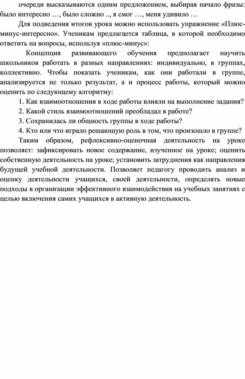 Таким образом, рефлексивно-оценочная деятельность на уроке позволяет: зафиксировать новое содержание, изученное на уроке; оценить собственную деятельность на уроке; установить затруднения как направления будущей учебной деятельности. Позволяет педагогу проводить анализ и оценку деятельности учащихся, своей деятельности, определять новые подходы в организации эффективного взаимодействия на учебных занятиях с целью включения самих учащихся в активную деятельность.