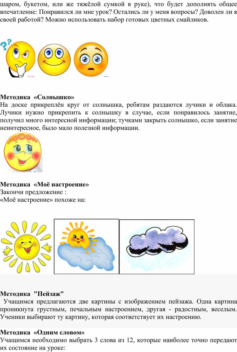 Проведение рефлексии настроения и эмоционального состояния целесообразно в начале урока с целью установления эмоционального контакта с группой и в конце деятельности.