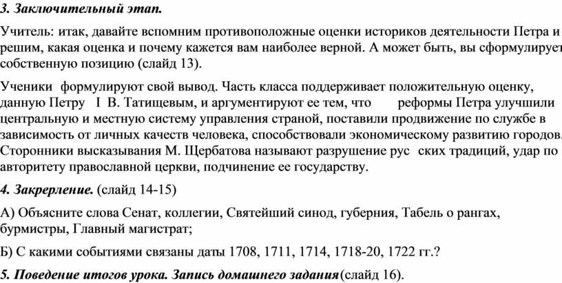 Ученики формулируют свой вывод. Часть класса поддерживает положительную оценку, данную Петру I В. Татищевым, и аргументируют ее тем, что реформы Петра улучшили центральную и местную систему управления страной, поставили продвижение по службе в зависимость от личных качеств человека, способствовали экономическому развитию городов. Сторонники высказывания М. Щербатова называют разрушение русских традиций, удар по авторитету православной церкви, подчинение ее государству.