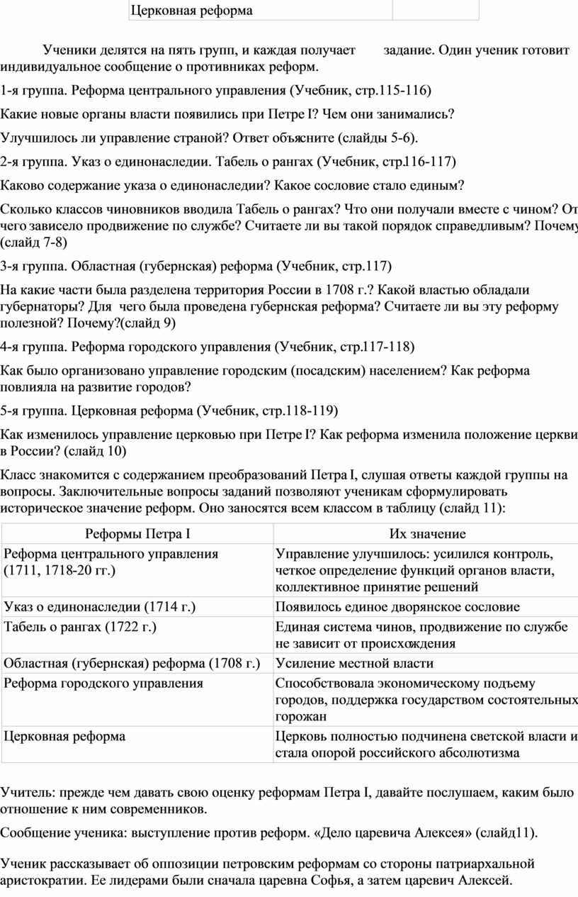 Ученики делятся на пять групп, и каждая получает задание. Один ученик готовит индивидуальное сообщение о противниках реформ.