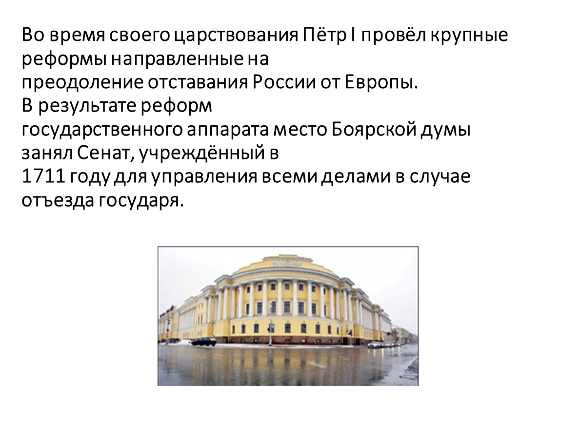 Во время своего царствования Пётр I провёл крупные реформы направленные напреодоление отставания России от Европы. В результате реформгосударственного аппарата место Боярской думы занял Сенат, учреждённый в1711 году для управления всеми делами в случае отъезда государя.