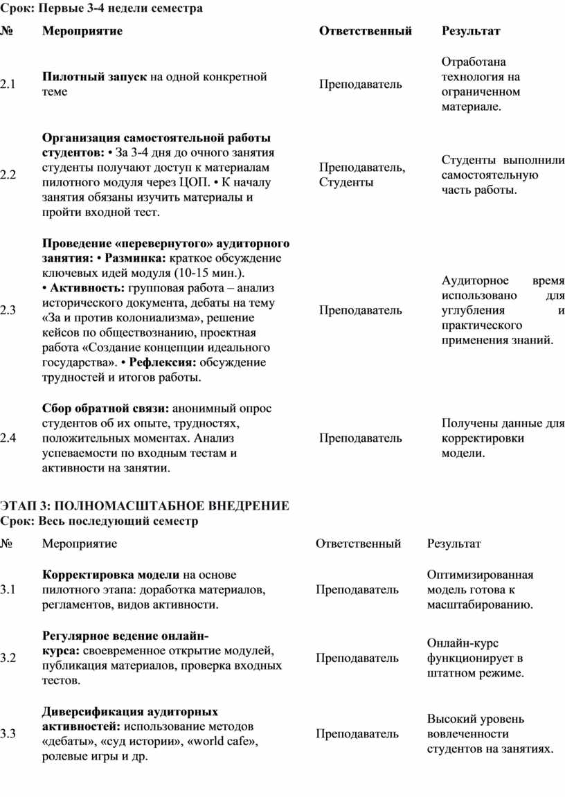 Цель внедрения: Перенос трансляции теоретического материала на самостоятельное изучение студентами с использованием цифровых платформ, с целью высвобождения аудиторного времени для организации активной познавательной, аналитической и проектной деятельности, формирования критического мышления и углубленного понимания исторических и социальных процессов.