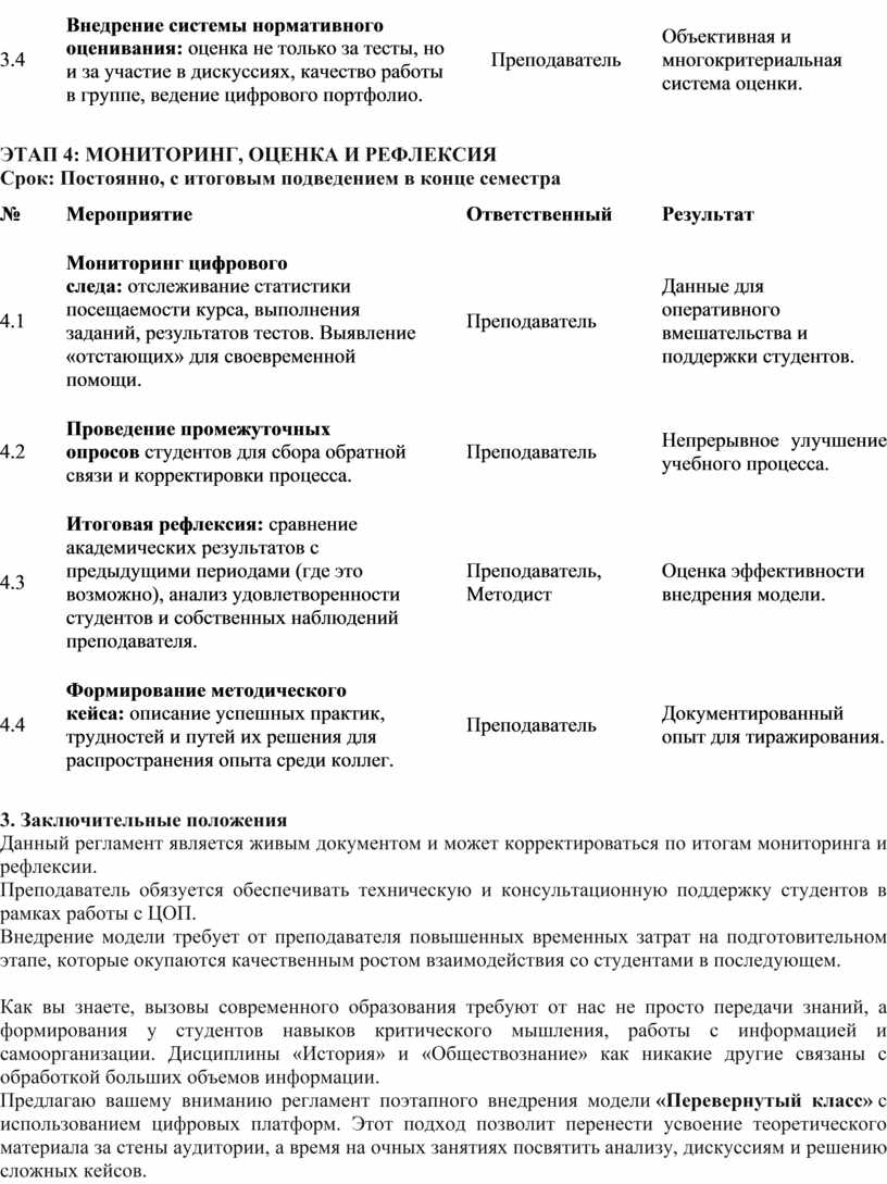 Предлагаю вашему вниманию регламент поэтапного внедрения модели «Перевернутый класс» с использованием цифровых платформ. Этот подход позволит перенести усвоение теоретического материала за стены аудитории, а время на очных занятиях посвятить анализу, дискуссиям и решению сложных кейсов.