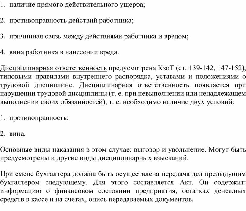 Дисциплинарная ответственность предусмотрена КзоТ (ст. 139-142, 147-152), типовыми правилами внутреннего распорядка, уставами и положениями о трудовой дисциплине. Дисциплинарная ответственность появляется при нарушении трудовой дисциплины (т. е. при невыполнении или ненадлежащем выполнении своих обязанностей), т. е. необходимо наличие двух условий: