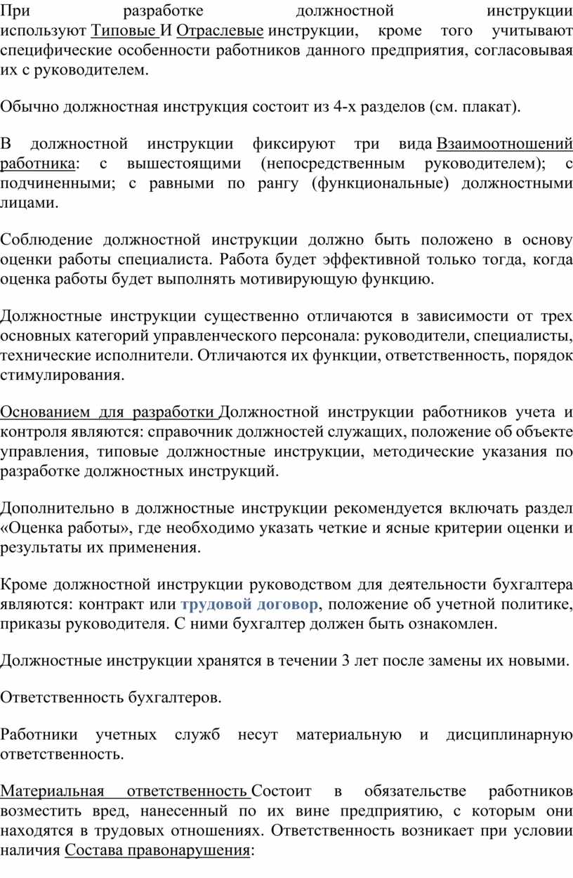 Основанием для разработки Должностной инструкции работников учета и контроля являются: справочник должностей служащих, положение об объекте управления, типовые должностные инструкции, методические указания по разработке должностных инструкций.