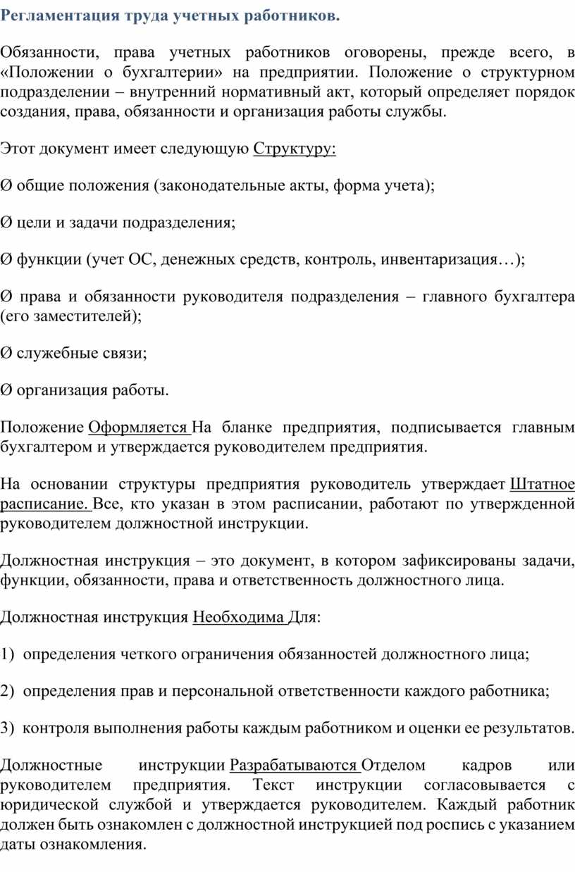 Обязанности, права учетных работников оговорены, прежде всего, в «Положении о бухгалтерии» на предприятии. Положение о структурном подразделении – внутренний нормативный акт, который определяет порядок создания, права, обязанности и организация работы службы.