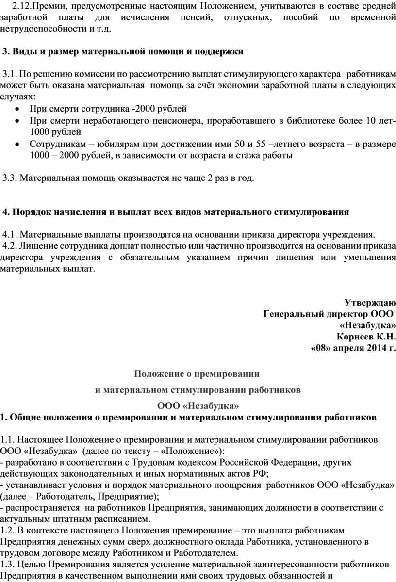 1.4. Настоящим Положением под материальным стимулированием следует понимать выплату работникам денежных сумм сверх размера должностного оклада.