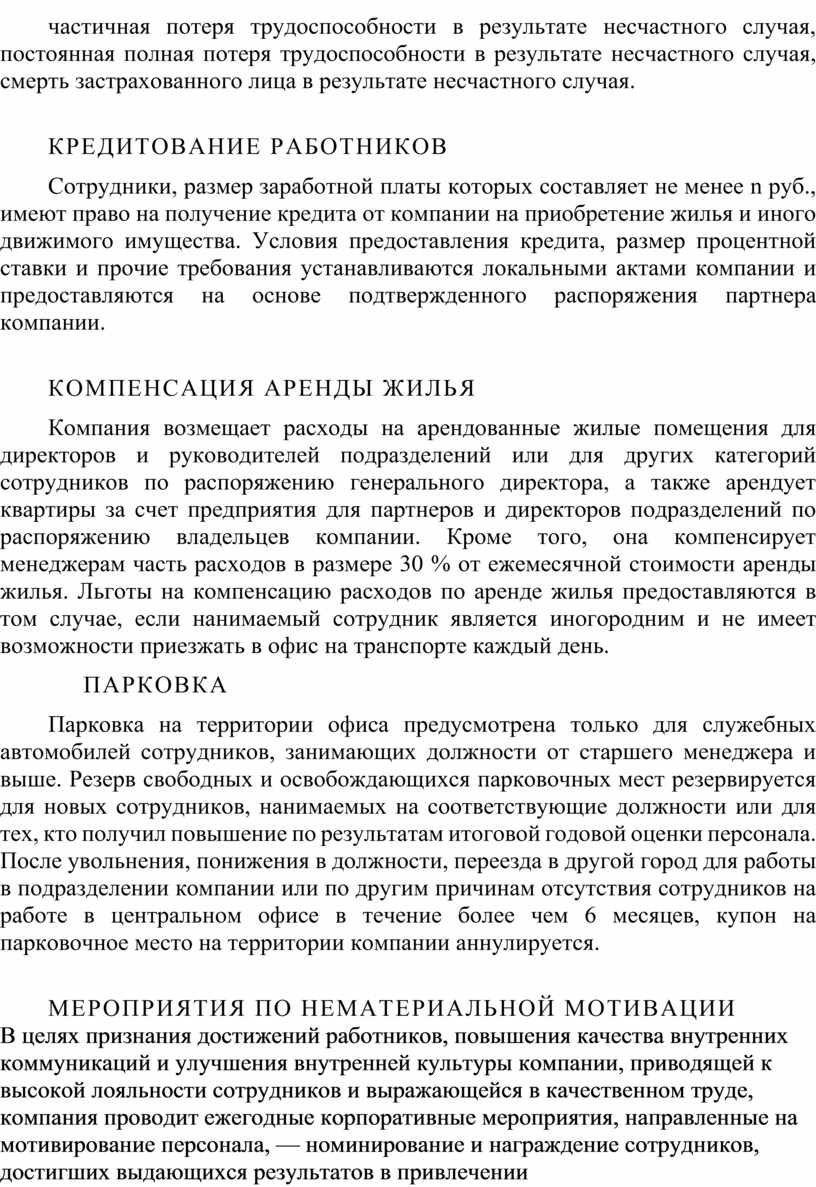 Сотрудники, размер заработной платы которых составляет не менее n руб., имеют право на получение кредита от компании на приобретение жилья и иного движимого имущества. Условия предоставления кредита, размер процентной ставки и прочие требования устанавливаются локальными актами компании и предоставляются на основе подтвержденного распоряжения партнера компании.