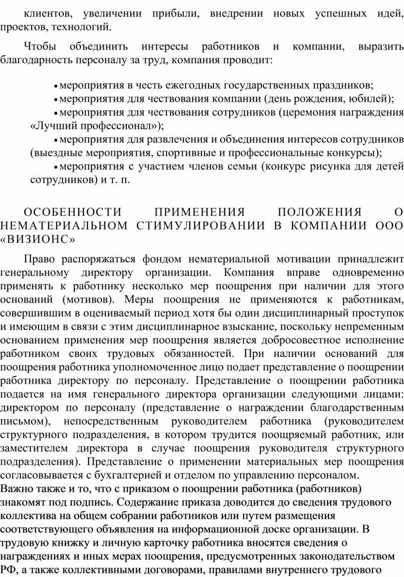 ОСОБЕННОСТИ ПРИМЕНЕНИЯ ПОЛОЖЕНИЯ О НЕМАТЕРИАЛЬНОМ СТИМУЛИРОВАНИИ В КОМПАНИИ ООО «ВИЗИОНС»