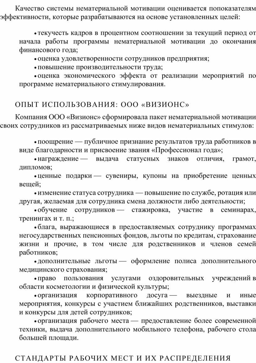 Отдел по управлению персоналом разрабатывает программы мероприятий по нематериальной мотивации сотрудников компании и оформляет план их проведения в формализованных документах, основанных на положении о нематериальной мотивации сотрудников компании ООО «Визионс» и утвержденных директором по персоналу. В программах мероприятий используются методы, средства, способы нематериальной мотивации, наиболее точно отвечающие потребностям компании и установленным стратегическим целям.