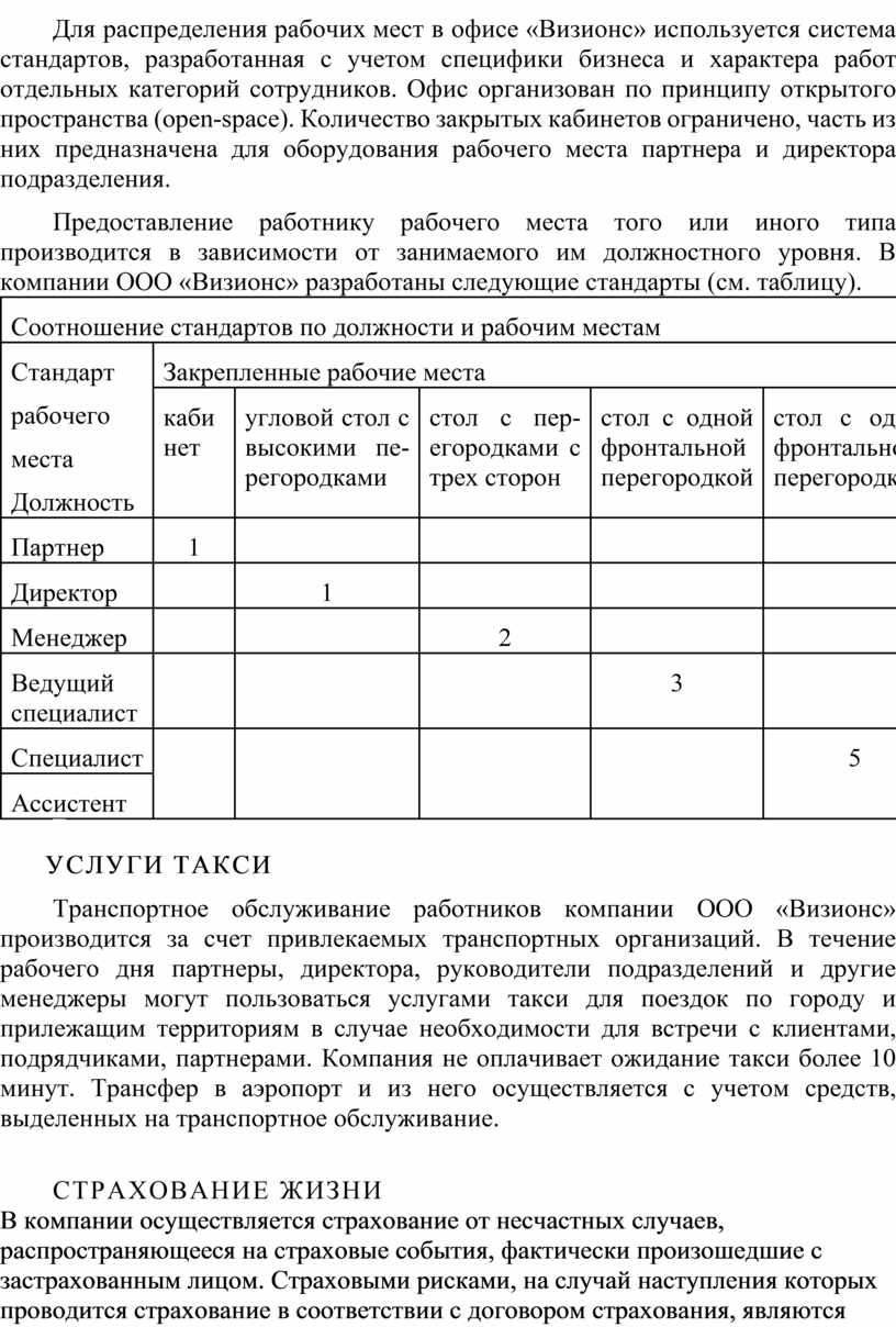 Предоставление работнику рабочего места того или иного типа производится в зависимости от занимаемого им должностного уровня. В компании ООО «Визионс» разработаны следующие стандарты (см. таблицу).