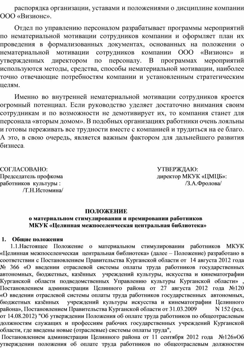 1.1.Настоящее Положение о материальном стимулировании работников МКУК «Целинная межпоселенческая центральная библиотека» (далее – Положение) разработано в соответствии с Постановлением Правительства Курганской области от 14 августа 2012 года № 366 «О введении отраслевой системы оплаты труда работников государственных автономных, бюджетных, казённых учреждений культуры, искусства и кинематографии Курганской области подведомственных Управлению культуры Курганской области» , Постановлением администрации Целинного района от 27 августа 2012 года №120 «О введении отраслевой системы оплаты труда работников государственных автономных, бюджетных казённых учреждений культуры искусства и кинематографии Целинного района», Постановлением Правительства Курганской области от 31.03.2009 N 152 (ред. от 14.08.2012) "Об утверждении Положения об оплате труда работников по общеотраслевым должностям служащих и профессиям рабочих государственных учреждений Курганской области, где введены новые (отраслевые) системы оплаты труда",