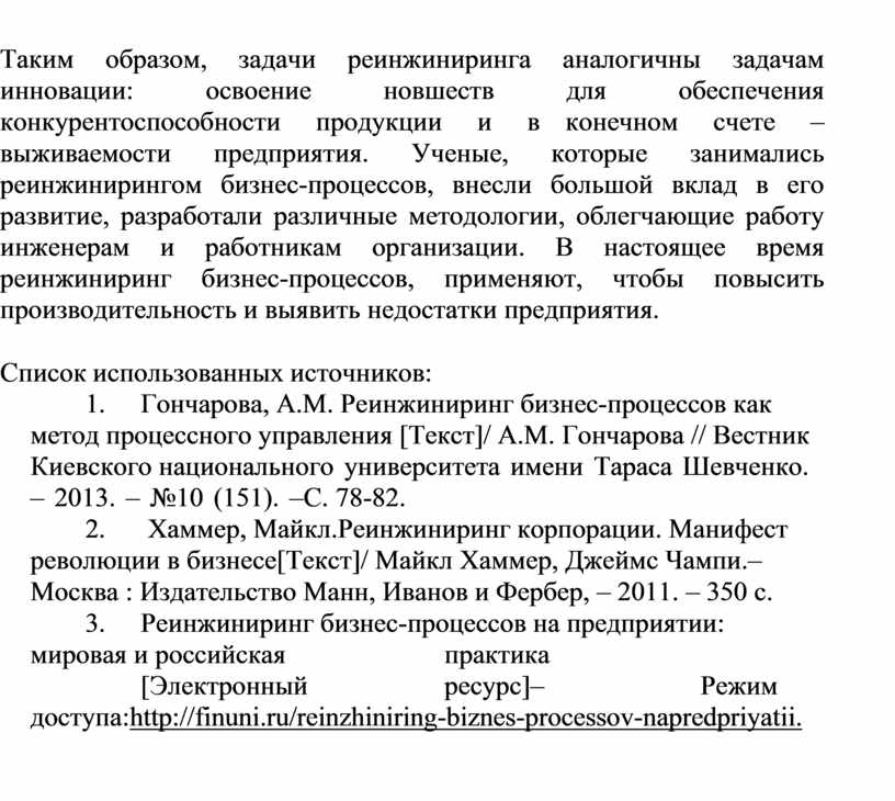 1. Гончарова, А.М. Реинжиниринг бизнес-процессов как метод процессного управления [Текст]/ А.М. Гончарова // Вестник Киевского национального университета имени Тараса Шевченко. – 2013. – №10 (151). – C. 78-82.