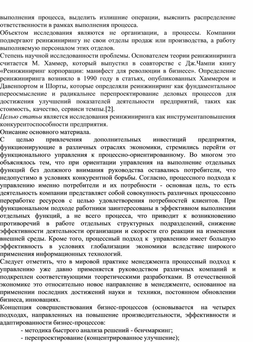 Степень научной исследованности проблемы. Основателем теории реинжиниринга считается М. Хаммер, который выпустил в соавторстве с Дж.Чампи книгу «Реинжиниринг корпорации: манифест для революции в бизнесе». Определение реинжиниринга возникло в 1990 году в статьях, опубликованных Хаммером и Давенпортом и Шорты, которые определяли реинжиниринг как фундаментальное переосмысление и радикальнее перепроектирование деловых процессов для достижения улучшений показателей деятельности предприятий, таких как стоимость, качество, сервис и темпы.[2].