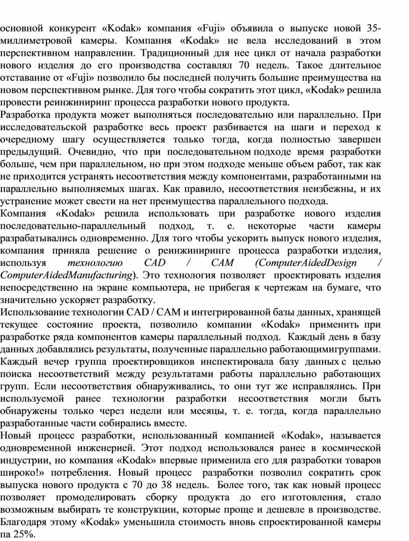 основной конкурент «Kodak» компания «Fuji» объявила о выпуске новой 35- миллиметровой камеры. Компания «Kodak» не вела исследований в этом перспективном направлении. Традиционный для нее цикл от начала разработки нового изделия до его производства составлял 70 недель. Такое длительное отставание от «Fuji» позволило бы последней получить большие преимущества на новом перспективном рынке. Для того чтобы сократить этот цикл, «Kodak» решила провести реинжиниринг процесса разработки нового продукта.