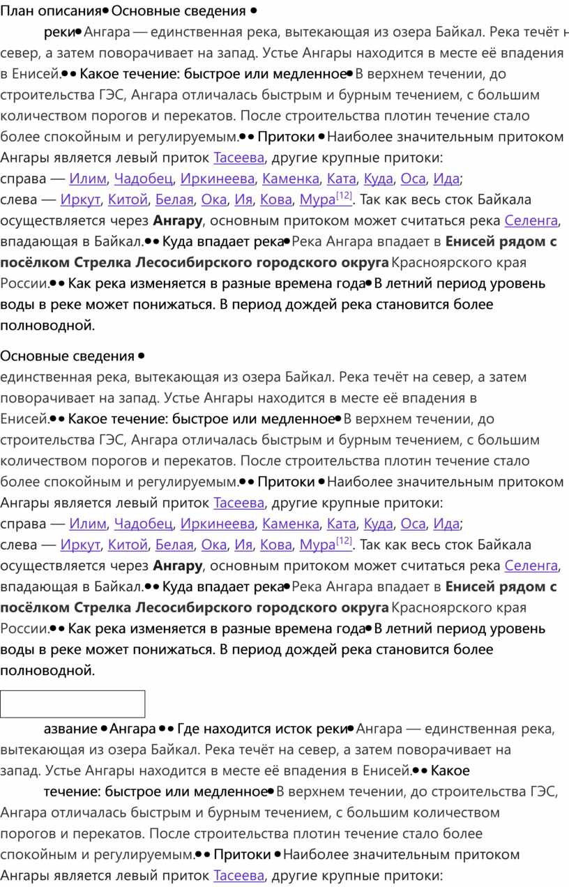 Ангара — единственная река, вытекающая из озера Байкал. Река течёт на север, а затем поворачивает на запад. Устье Ангары находится в месте её впадения в Енисей. |