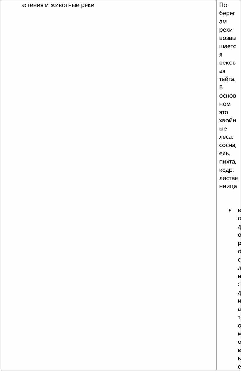 По берегам реки возвышается вековая тайга. В основном это хвойные леса: сосна, ель, пихта, кедр, лиственница.