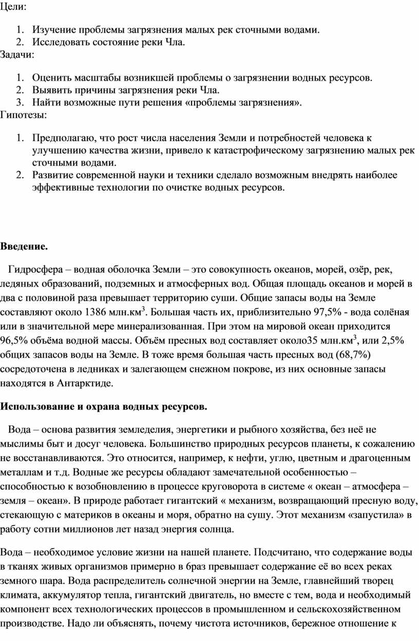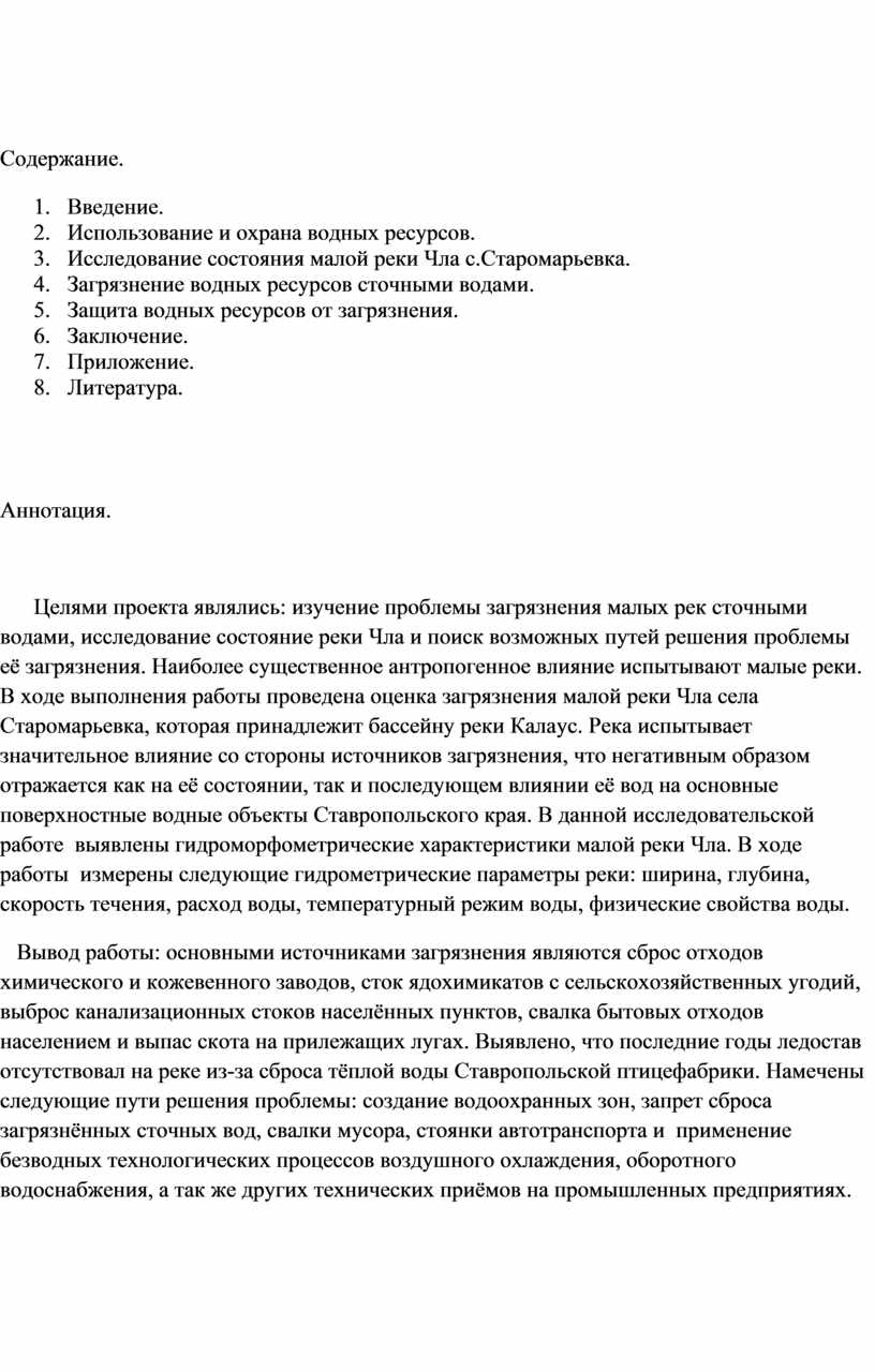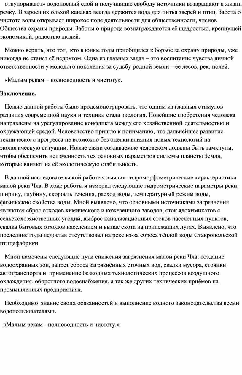 Целями проекта являлись: изучение проблемы загрязнения малых рек сточными водами, исследование состояние реки Чла и поиск возможных путей решения проблемы её загрязнения. Наиболее существенное антропогенное влияние испытывают малые реки. В ходе выполнения работы проведена оценка загрязнения малой реки Чла села Старомарьевка, которая принадлежит бассейну реки Калаус. Река испытывает значительное влияние со стороны источников загрязнения, что негативным образом отражается как на её состоянии, так и последующем влиянии её вод на основные поверхностные водные объекты Ставропольского края. В данной исследовательской работе выявлены гидроморфометрические характеристики малой реки Чла. В ходе работы измерены следующие гидрометрические параметры реки: ширина, глубина, скорость течения, расход воды, температурный режим воды, физические свойства воды.