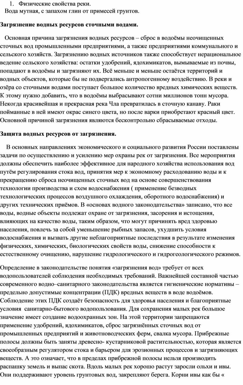 Основная причина загрязнения водных ресурсов – сброс в водоёмы неочищенных сточных вод промышленными предприятиями, а также предприятиями коммунального и сельского хозяйств. Загрязнению водных источников также способствует нерациональное ведение сельского хозяйства: остатки удобрений, ядохимикатов, вымываемые из почвы, попадают в водоёмы и загрязняют их. Всё меньше и меньше остаётся территорий и водных объектов, которые бы не подвергались антропогенному воздействию. В реки и озёра со сточными водами поступает большое количество вредных химических веществ. К этому нужно добавить, что в водоёмы выбрасывают сотни миллионов тонн мусора. Некогда красивейшая и прекрасная река Чла превратилась в сточную канаву. Раки пойманные в ней имеют окрас синего цвета, но после варки приобретают красный цвет. Основной причиной загрязнения являются бесконтрольно сбрасываемые отходы.