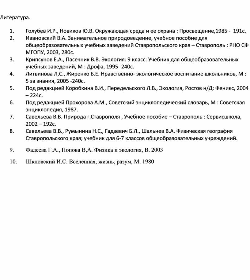 2. Ивановский В.А. Занимательное природоведение, учебное пособие для общеобразовательных учебных заведений Ставропольского края – Ставрополь : РНО СФ МГОПУ, 2003, 280с.