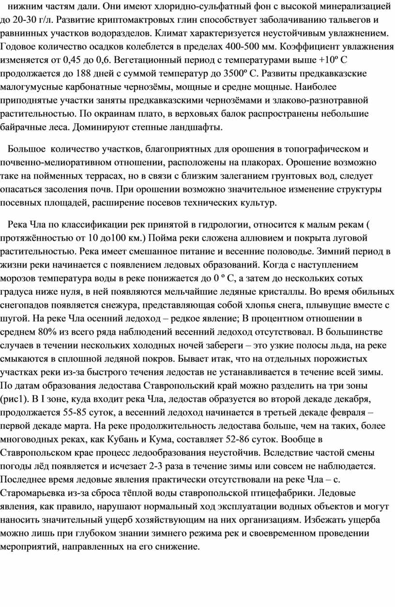 Река Чла по классификации рек принятой в гидрологии, относится к малым рекам ( протяжённостью от 10 до100 км.) Пойма реки сложена аллювием и покрыта луговой растительностью. Река имеет смешанное питание и весенние половодье. Зимний период в жизни реки начинается с появлением ледовых образований. Когда с наступлением морозов температура воды в реке понижается до 0 º С, а затем до нескольких сотых градуса ниже нуля, в ней появляются мельчайшие ледяные кристаллы. Во время обильных снегопадов появляется снежура, представляющая собой хлопья снега, плывущие вместе с шугой. На реке Чла осенний ледоход – редкое явление; В процентном отношении в среднем 80% из всего ряда наблюдений весенний ледоход отсутствовал. В большинстве случаев в течении нескольких холодных ночей забереги – это узкие полосы льда, на реке смыкаются в сплошной ледяной покров. Бывает итак, что на отдельных порожистых участках реки из-за быстрого течения ледостав не устанавливается в течение всей зимы. По датам образования ледостава Ставропольский край можно разделить на три зоны (рис1). В I зоне, куда входит река Чла, ледостав образуется во второй декаде декабря, продолжается 55-85 суток, а весенний ледоход начинается в третьей декаде февраля – первой декаде марта. На реке продолжительность ледостава больше, чем на таких, более многоводных реках, как Кубань и Кума, составляет 52-86 суток. Вообще в Ставропольском крае процесс ледообразования неустойчив. Вследствие частой смены погоды лёд появляется и исчезает 2-3 раза в течение зимы или совсем не наблюдается. Последнее время ледовые явления практически отсутствовали на реке Чла – с. Старомарьевка из-за сброса тёплой воды ставропольской птицефабрики. Ледовые явления, как правило, нарушают нормальный ход эксплуатации водных объектов и могут наносить значительный ущерб хозяйствующим на них организациям. Избежать ущерба можно лишь при глубоком знании зимнего режима рек и своевременном проведении мероприятий, направленных на его снижение.