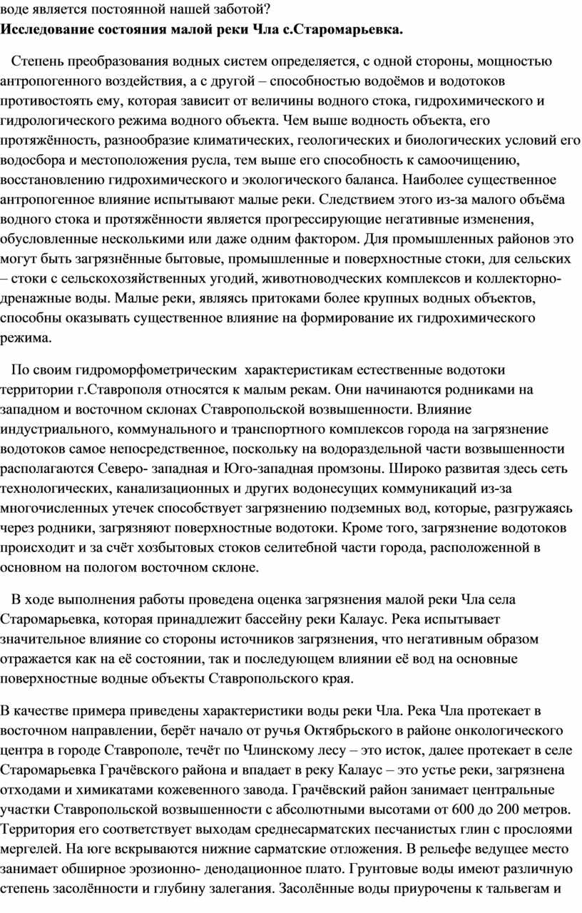 В качестве примера приведены характеристики воды реки Чла. Река Чла протекает в восточном направлении, берёт начало от ручья Октябрьского в районе онкологического центра в городе Ставрополе, течёт по Члинскому лесу – это исток, далее протекает в селе Старомарьевка Грачёвского района и впадает в реку Калаус – это устье реки, загрязнена отходами и химикатами кожевенного завода. Грачёвский район занимает центральные участки Ставропольской возвышенности с абсолютными высотами от 600 до 200 метров. Территория его соответствует выходам среднесарматских песчанистых глин с прослоями мергелей. На юге вскрываются нижние сарматские отложения. В рельефе ведущее место занимает обширное эрозионно- денодационное плато. Грунтовые воды имеют различную степень засолённости и глубину залегания. Засолённые воды приурочены к тальвегам и нижним частям дали. Они имеют хлоридно-сульфатный фон с высокой минерализацией до 20-30 г/л. Развитие криптомактровых глин способствует заболачиванию тальвегов и равнинных участков водоразделов. Климат характеризуется неустойчивым увлажнением. Годовое количество осадков колеблется в пределах 400-500 мм. Коэффициент увлажнения изменяется от 0,45 до 0,6. Вегетационный период с температурами выше +10º С продолжается до 188 дней с суммой температур до 3500º С. Развиты предкавказские малогумусные карбонатные чернозёмы, мощные и средне мощные. Наиболее приподнятые участки заняты предкавказскими чернозёмами и злаково-разнотравной растительностью. По окраинам плато, в верховьях балок распространены небольшие байрачные леса. Доминируют степные ландшафты.