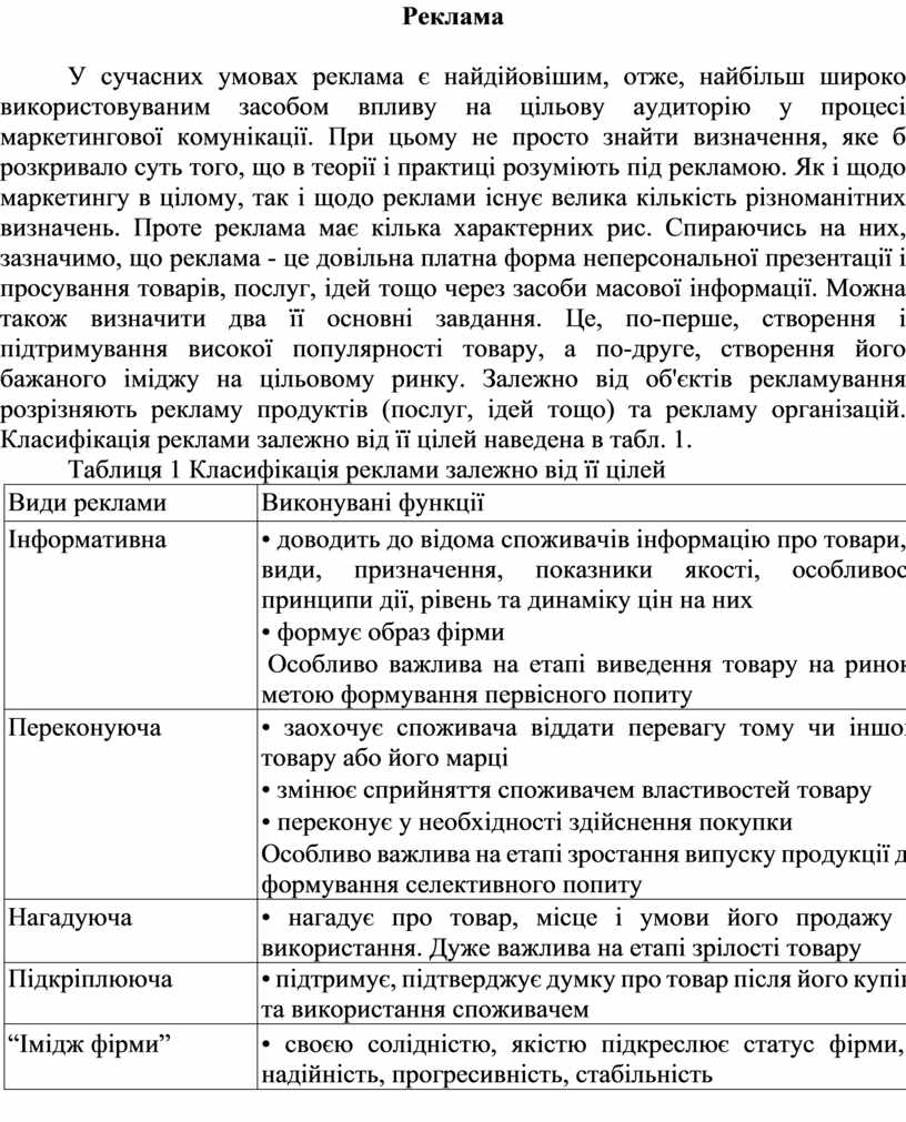Таблиця 1 Класифікація реклами залежно від її цілей