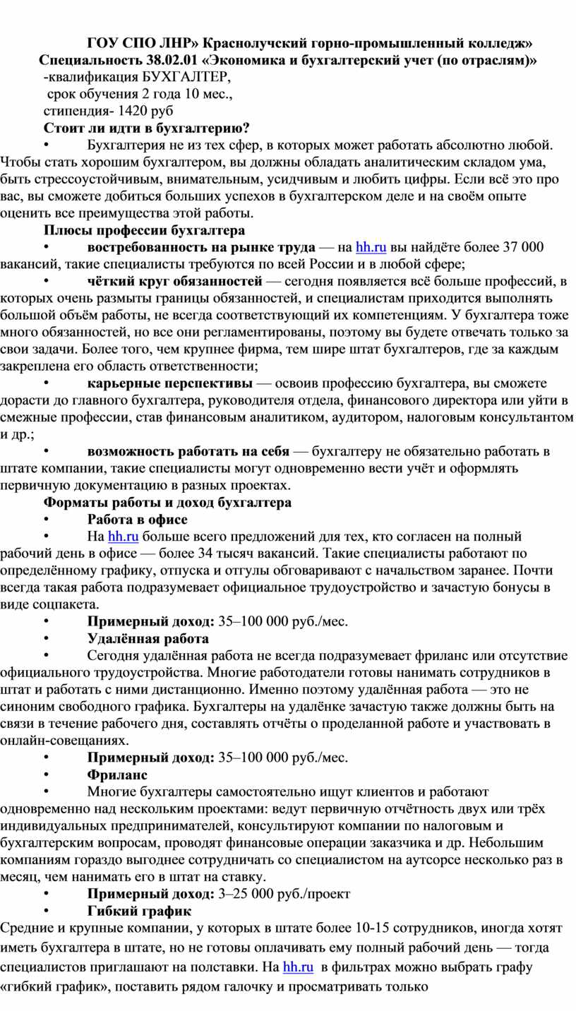 ГОУ СПО ЛНР « Краснолучский горно-промышленный колледж» Специальность 38.02.01 «Экономика и бухгалтерский учет (по отраслям)» -квалификация БУХГАЛТЕР, срок обучения 2 года 10 мес., стипендия- 1420 руб Плюсы профессии бухгалтера: востребованность на рынке труда; чёткий круг обязанностей; карьерные перспективы; возможность работать на себя. Форматы работы и доход бухгалтера в месяц: Работа в офисе -примерный доход: 35–100 000 руб; Удалённая работа - примерный доход:35–100 000 р Фриланс - примерный доход: 3–25 000 руб./проект; Гибкий график - примерный доход: 20–70 000 руб От чего зависит зарплата бухгалтера: размер компании и сфера её деятельности; специализация сотрудника; график работы; компетенции; личностные характеристики; город. Специализации бухгалтера: начисление заработной платы; работа с основными средствами; работа с кассой; учет материалов на складе; расчёты с контрагентами; банковские операции Карьера от помощника бухгалтера до финансового директора Основные направления развития, которые помогут каждому бухгалтеру лучше работать и больше зарабатывать: прокачка скиллов; освоение бухгалтерского софта; изучение налогов и налогообложения