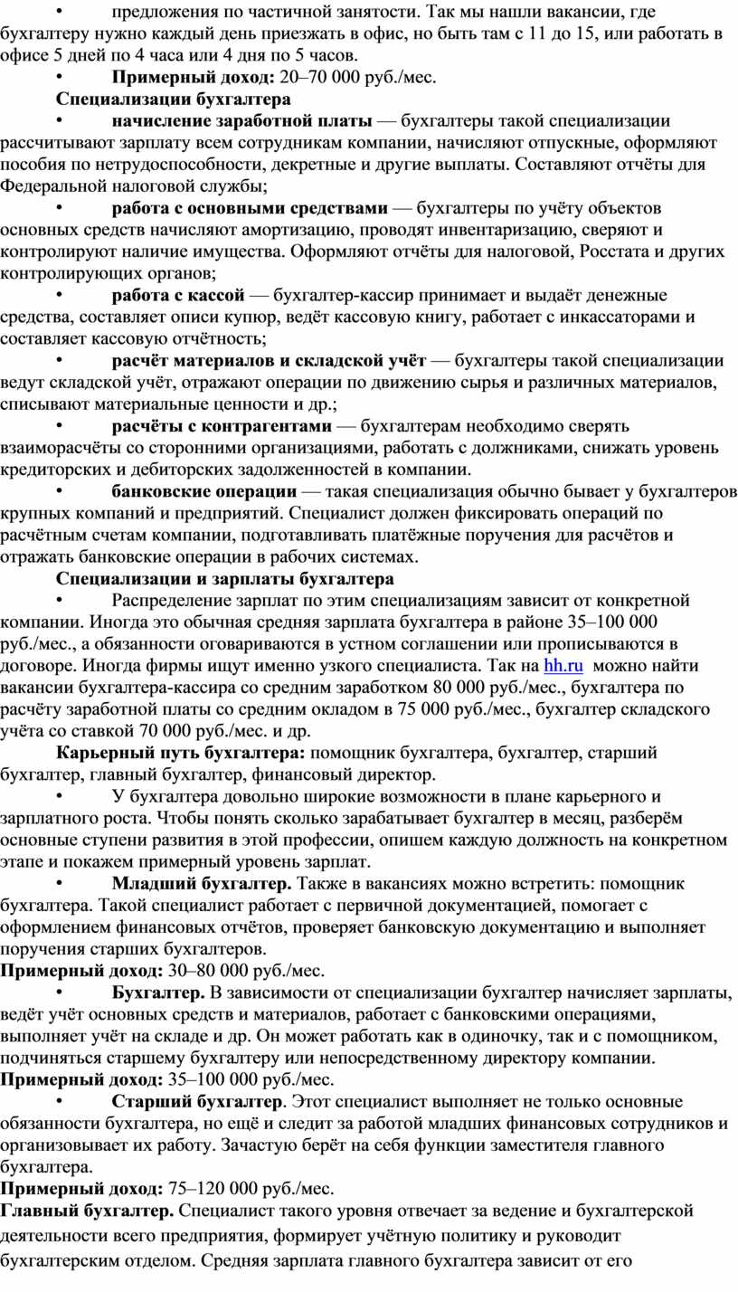 • Распределение зарплат по этим специализациям зависит от конкретной компании. Иногда это обычная средняя зарплата бухгалтера в районе 35–100 000 руб./мес., а обязанности оговариваются в устном соглашении или прописываются в договоре. Иногда фирмы ищут именно узкого специалиста. Так на hh.ru можно найти вакансии бухгалтера-кассира со средним заработком 80 000 руб./мес., бухгалтера по расчёту заработной платы со средним окладом в 75 000 руб./мес., бухгалтер складского учёта со ставкой 70 000 руб./мес. и др.