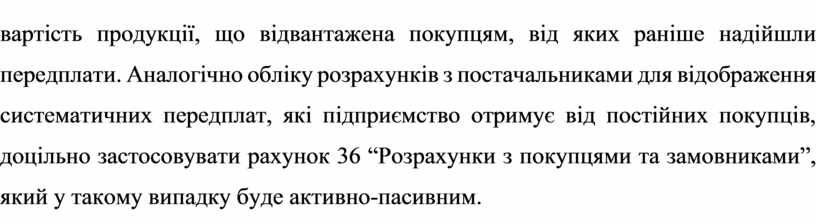 вартість продукції, що відвантажена покупцям, від яких раніше надійшли передплати. Аналогічно обліку розрахунків з постачальниками для відображення систематичних передплат, які підприємство отримує від постійних покупців, доцільно застосовувати рахунок 36 “Розрахунки з покупцями та замовниками”, який у такому випадку буде активно-пасивним.