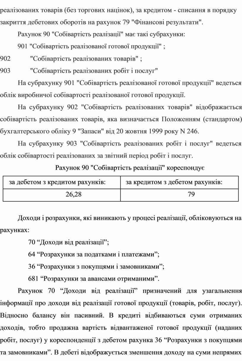 Рахунок 90 "Собівартість реалізації" призначено для узагальнення інформації про собівартість реалізованої готової продукції, товарів, виконаних робіт, наданих послуг.